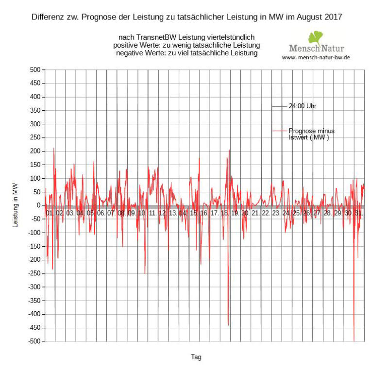 erzeugung nicht möglich ist. Die Abweichungen schwanken nicht selten über +/- 200 MW, in der Spitze sogar von -450 MW zu +200