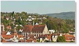 kleinteiligen Dachlandschaft und den Türmen unterhalb des sanft geschwungenen Hochberges in das Tal der Rems. Selbst